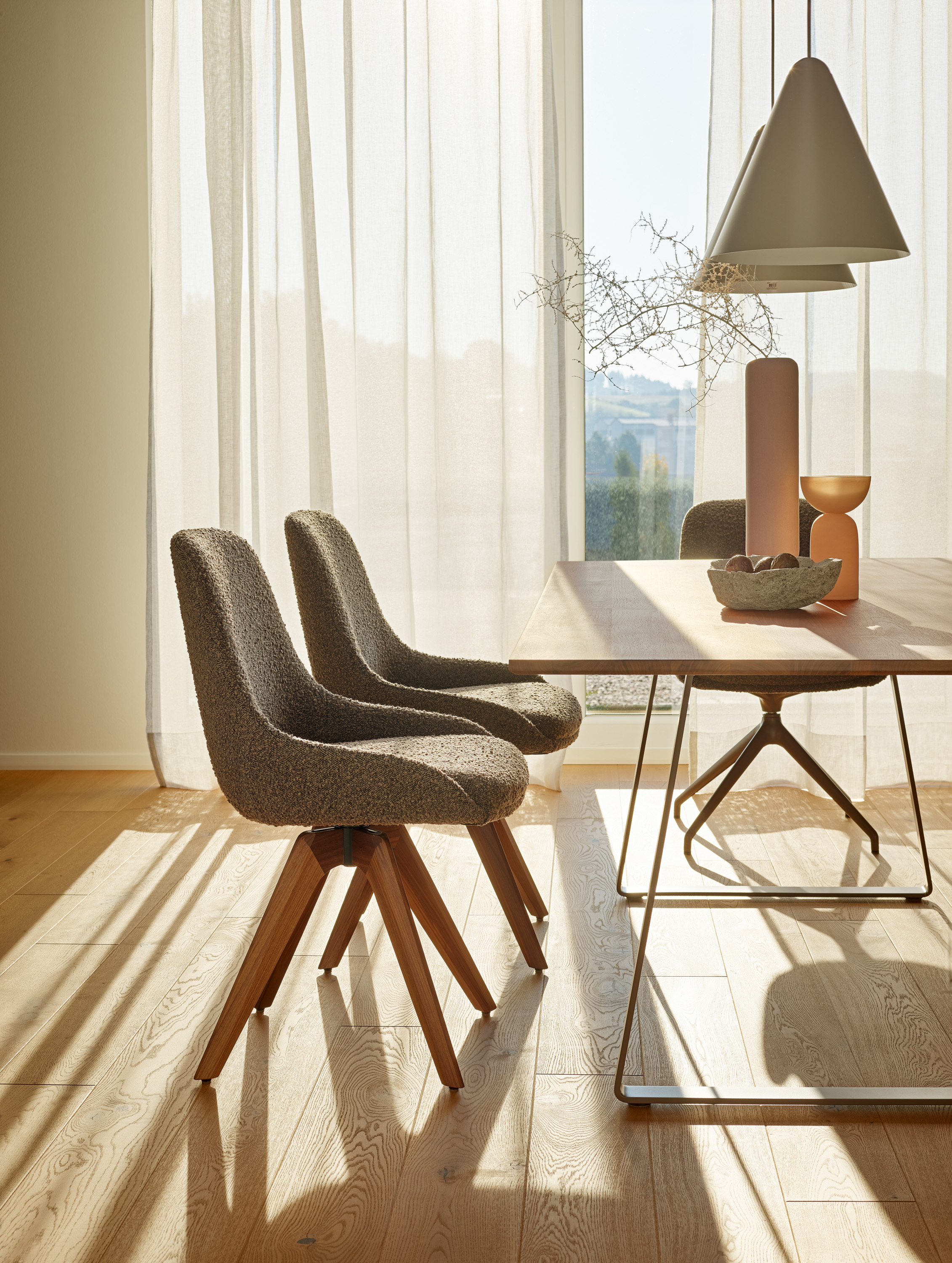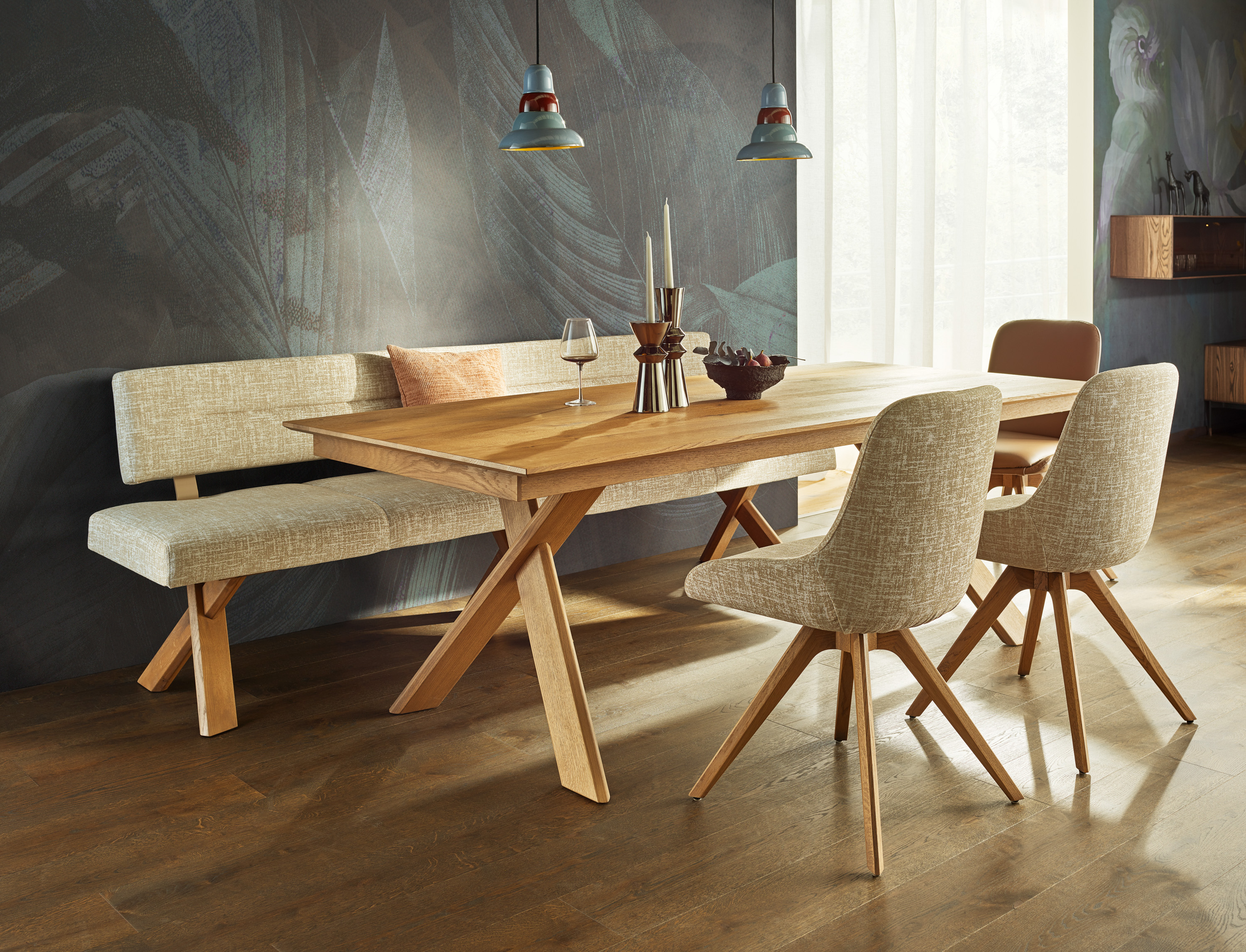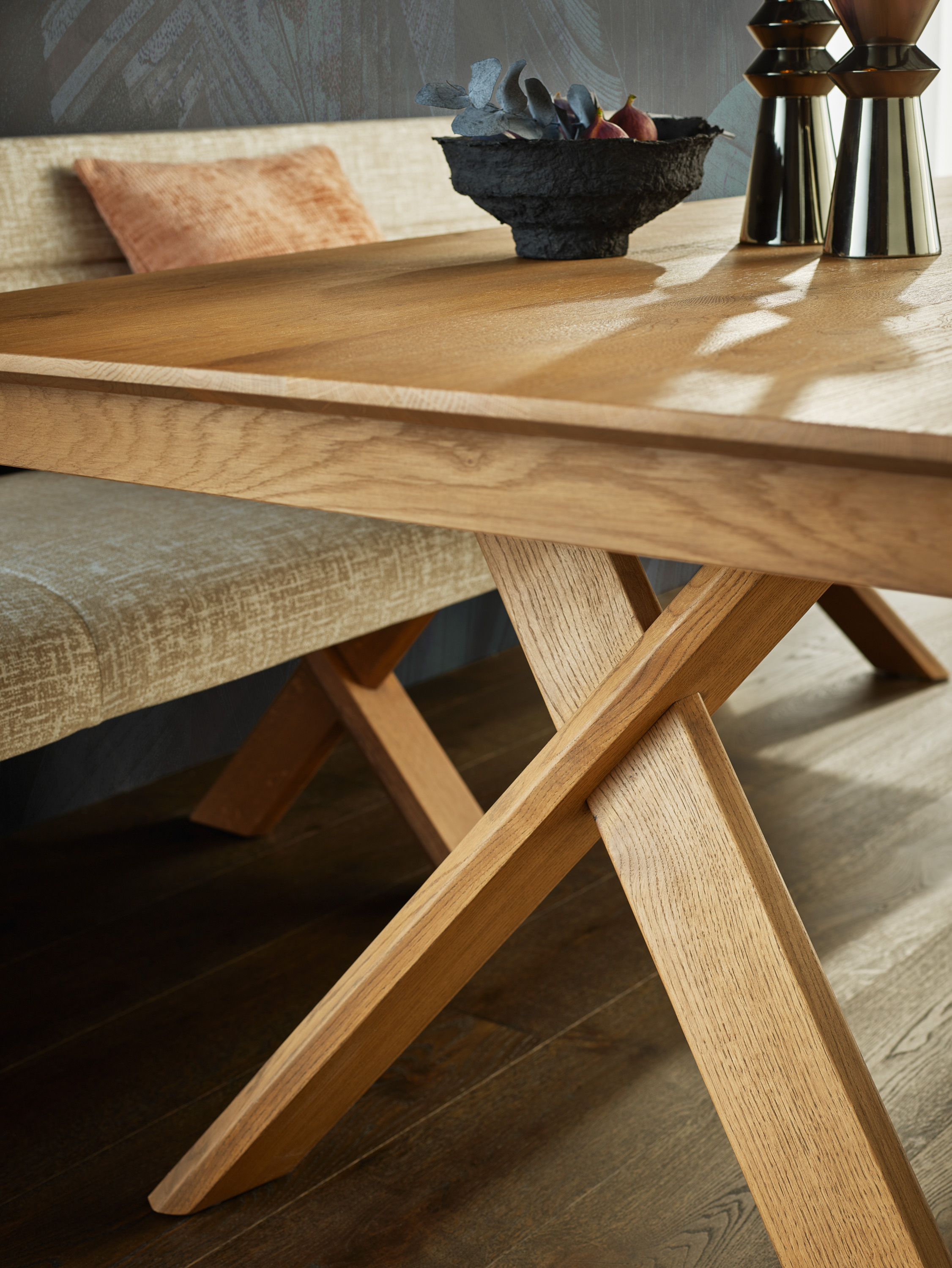 Das charakteristische X der Tischbeine trägt mehr als nur die massive Holzplatte – es trägt die ganze Eleganz einer reduzierten Formensprache. Feine Kanten, präzise Fügungen, handwerkliche Perfektion in jedem Detail. Das Holzgestell in X-Form ist das Fundament von Miro. Stabil, schön, zeitlos.