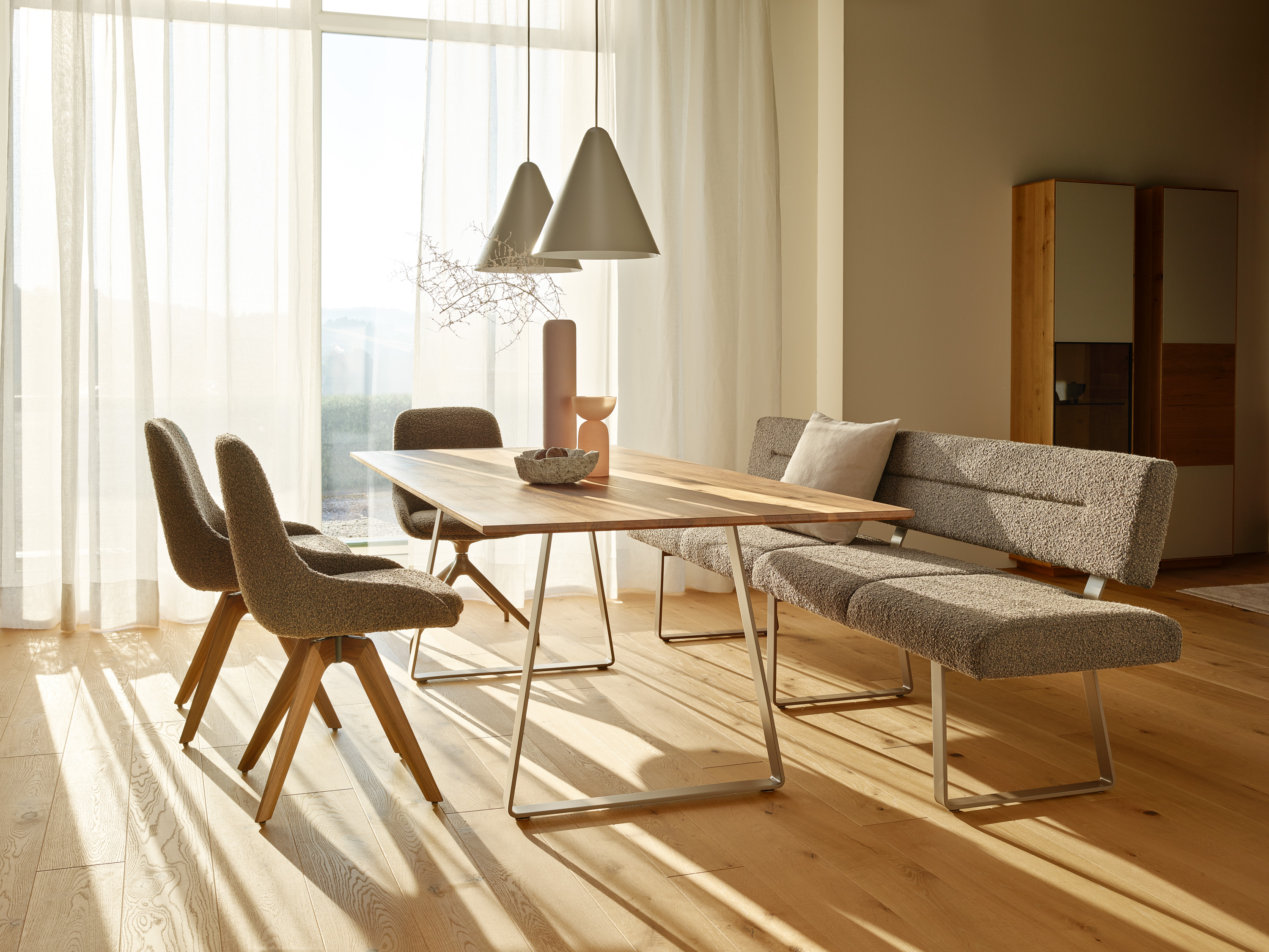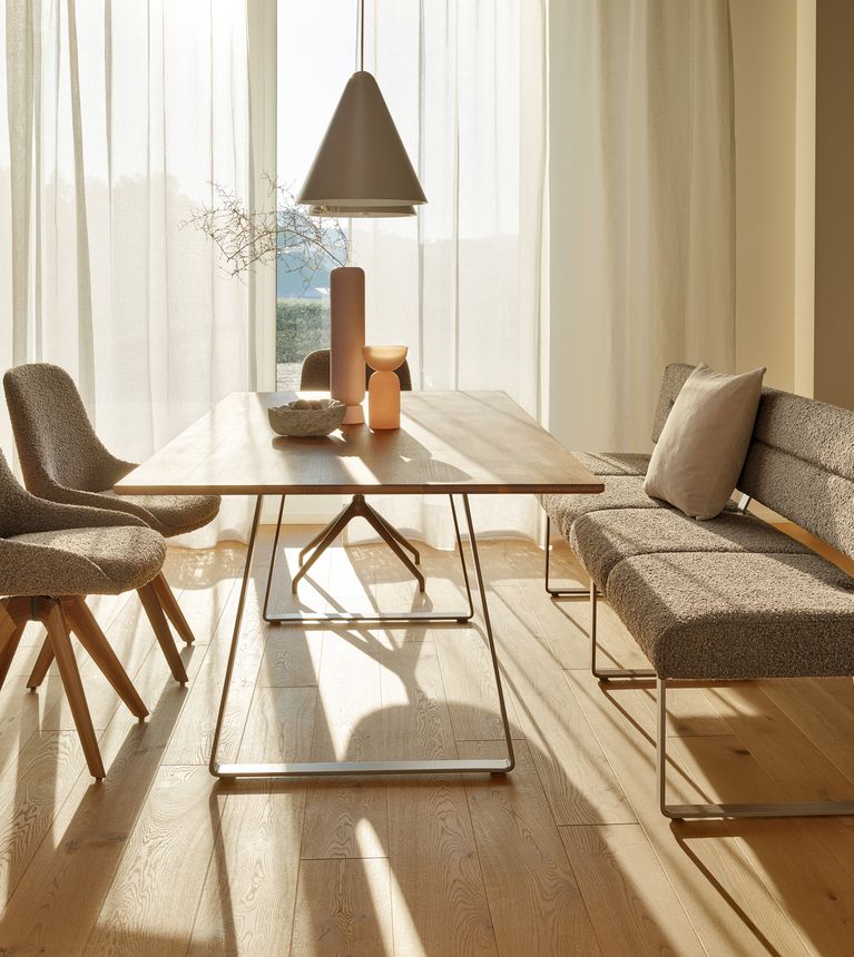 Bei Miro zählt jede Linie. Die schlanke Metallkuve trägt die massive Holzplatte mit selbstverständlicher Leichtigkeit.