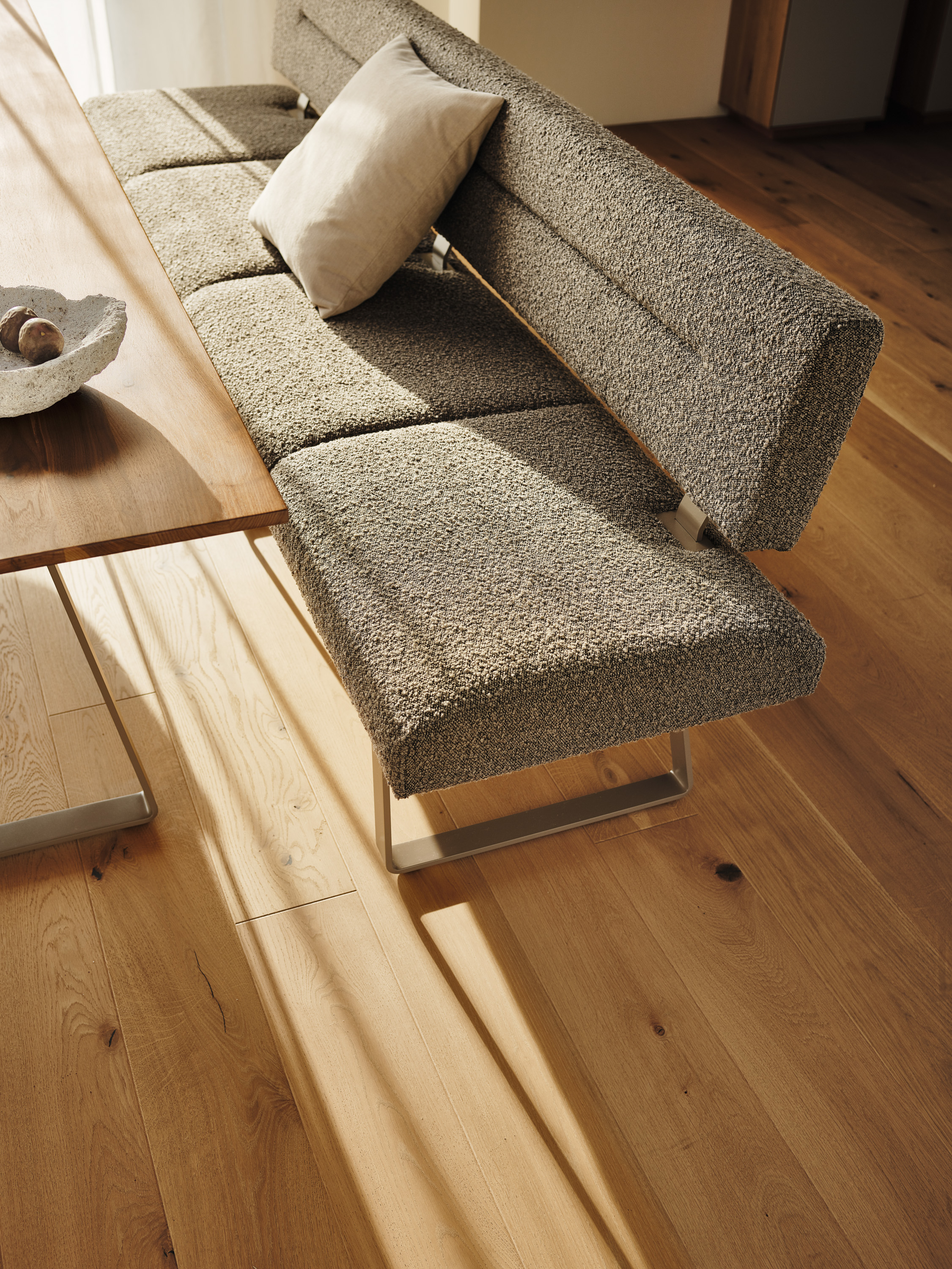 Bank und Stühle folgen dieser klaren Linie. Komfortable Polsterung, massive Holzrahmen – alles aufeinander abgestimmt. Ein Ensemble, das nach Maß gefertigt wird.