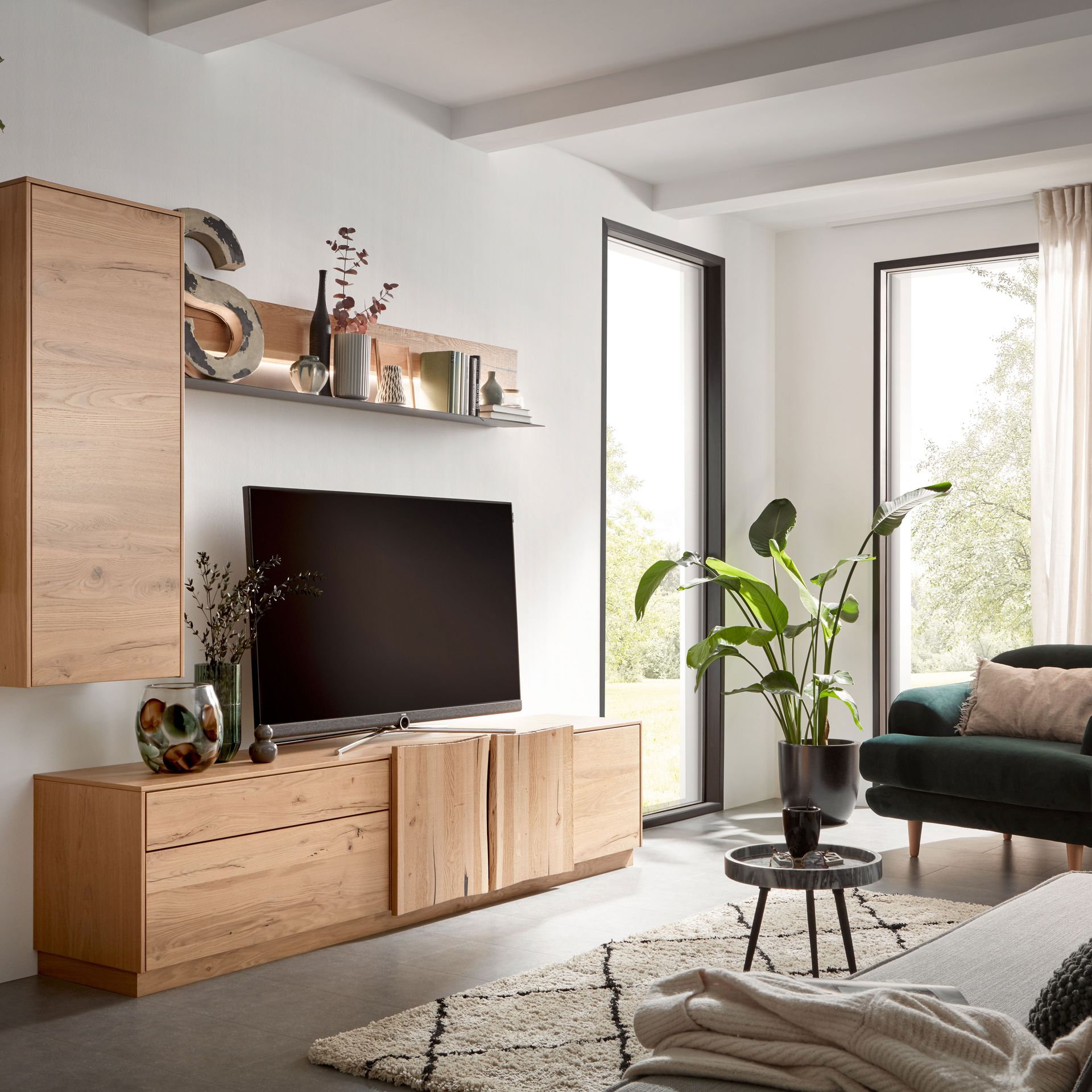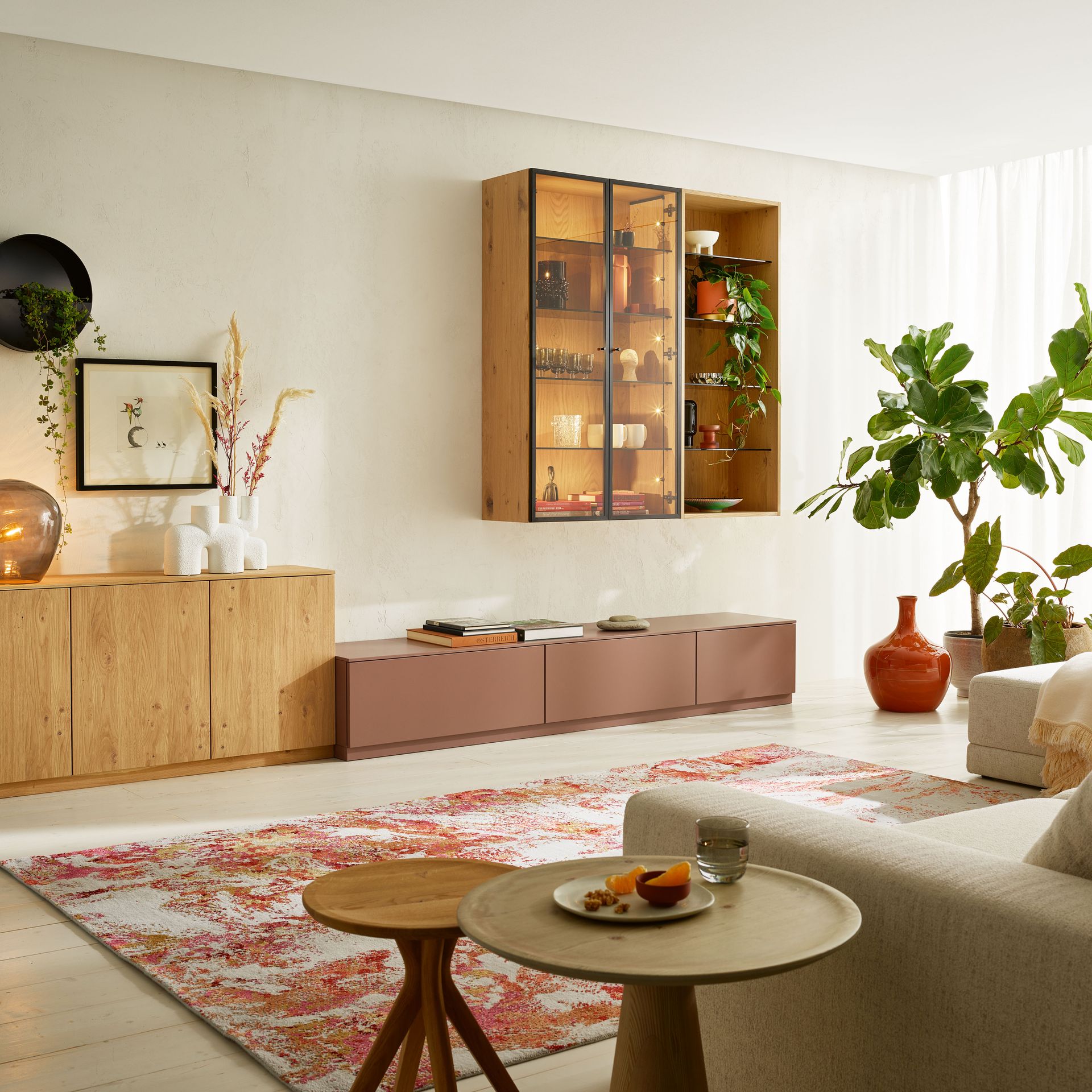 Im Wohnzimmer darf es auch ein bisschen mehr sein. Purismus ist das Eine, der topaktuelle Trend nach üppiger Deko das Andere. Es muss nicht immer schlicht sein und weniger ist auch nicht immer mehr. Deshalb halten auch wieder Samt, Seide und Brokat Einzug in unsere Wohnzimmer. Dazu gesellen sich warme Holztöne bei Regalen, Kommoden, Vitrinen und TV-Möbel.